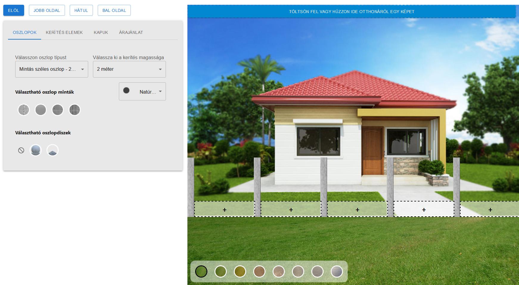 A tervező bal oldalán a panelen állítsd be a tervezett betonkerítésed magasságát, és válassz hozzá oszlopot. Itt a beton oszlop színét is megtudod adni, hogy harmonizáljon a leendő elemes betonkerítéseddel. Fontos tudni, hogy az oszlop minták nem minden szélességnél és magasságnál érhetők el.