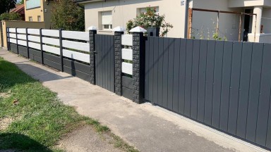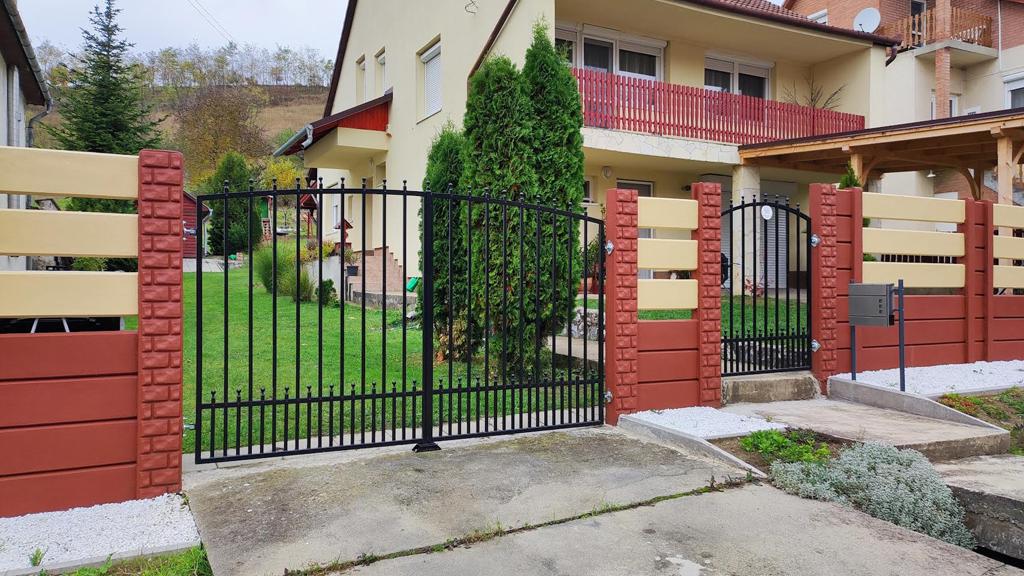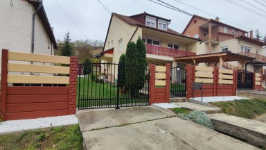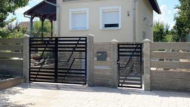 A10/7 Betonkerítés tégla mintás oszloppal és kovácsoltvas stílusú kétszárnyú kapuval