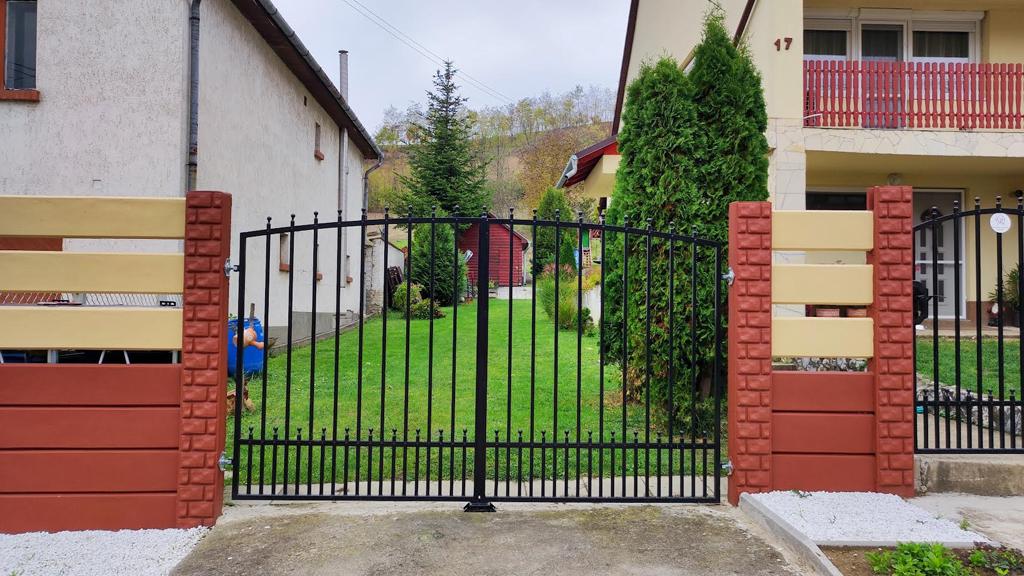 P1/7N típusú kerítés minimál gömbös, sűrű mintájú kovácsoltvas stílusú kapukkal